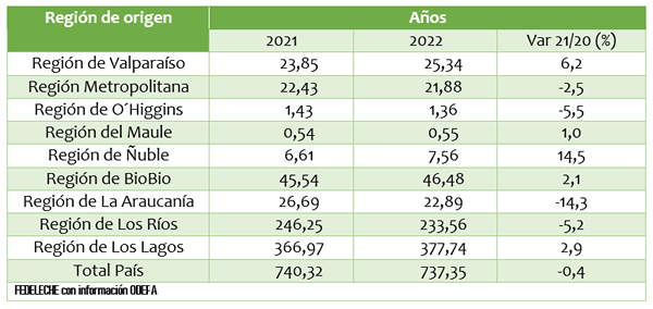En el primer cuatrimestre de 2022, las zonas con un mayor volumen de producción, las regiones de Los Lagos y Los Ríos, representan un 82,9% por ciento de lo que se recepciona por la industria láctea mayor, y que presentan un resultado mixto a marzo. En el resto del país lechero se aprecia una respuesta similar.