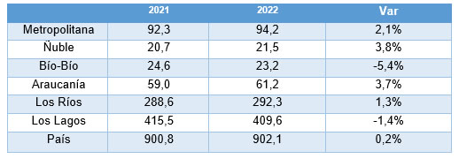 En la región de Los Ríos se registró una variación positiva de un 5,2% respecto del mismo mes de 2021, alcanzando un volumen total de 55,3 millones de litros, lo que representa un incremento de 2,7 millones de litros.