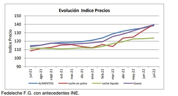 En el séptimo mes del año, entre los productos con mayor incidencia al alza aparece el queso con una variación 2,4 por ciento. Por otra parte, entre los productos con una mayor incidencia a la baja, dentro de los alimentos, no aparece ningún producto lácteo.