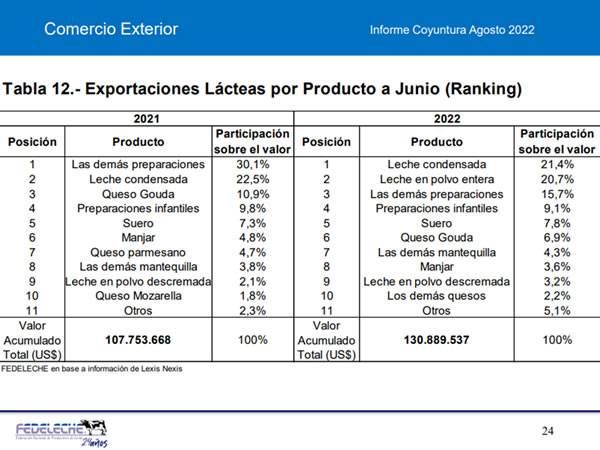 Según datos de Fedeleche en base a información de Lexis Nexis, las exportaciones de productos lácteos sumaron un valor total por US$ 130,9 millones al primer semestre de 2022, lo que representa un incremento de 21,5 % respecto del mismo periodo del año anterior, equivalente a un aumento de US$ 23,1 millones.
