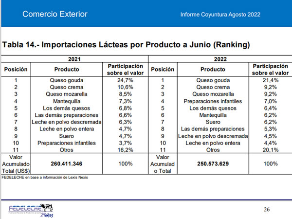 Durante el primer semestre de 2022, el valor de las importaciones de productos lácteos sumó US$ 250,6 millones, lo que representa una caída de un -3,8 % respecto de igual lapso del año previo. La baja equivale a US$ 9,8 millones.