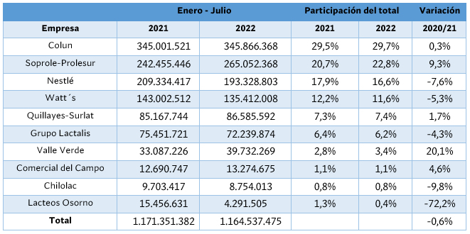 La recepción nacional a julio de 2022 sigue siendo liderada por Colun, cuya participación dentro del total alcanza un 29,7%. En los siete primeros meses del año, la cooperativa lechera de La Unión anota una variación de un 0,3% respecto del mismo mes del año previo, alcanzando 345,8 millones de litros, volumen que supone un aumento de apenas 864 mil litros.