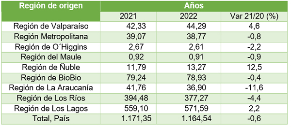 Finalmente, la región de El Maule registró una caída de 3,8% respecto de julio 2021, con un retroceso de 4.838 litros, sumando un total de 121 mil litros.
