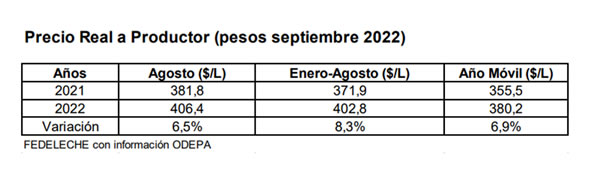 En agosto de 2022 el precio a productor anotó un aumento de un 6,5% respecto al mismo mes de 2021, escalando $24,65 por litro, al subir de $ 381,76 a $ 406,41 por litro.