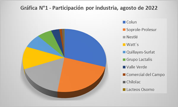Por su parte, Nestlé Chile registra hasta el mes de agosto una participación de un 16,6%, con una recepción de leche cruda que suma 219,3 millones de litros, lo que supone una baja de un 7,6% en relación al mismo lapso de 2021, acumulando una caída interanual de 18,0 millones de litros, una de las más relevante a la fecha.