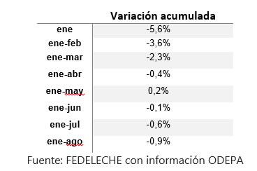 En el octavo mes del año, la producción de leche cruda en la región de Los Ríos anotó una variación negativa de un 2,0%, con una baja interanual de 1,0 millón de litros, alcanzando 52,50 millones de litros.