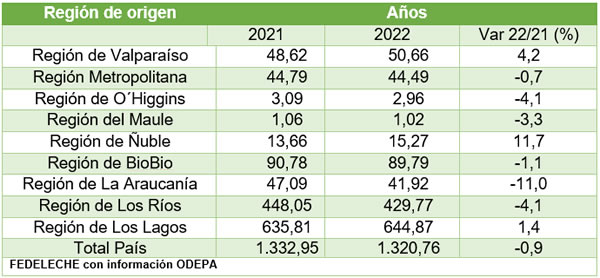 En la región de Los Lagos la producción de leche presentó al mes de agosto de 2022 una variación positiva de un 1,4 por ciento en relación con el año previo, encadenando un semestre al alza, y acumulando un volumen anual adicional de 9,0 millones de litros, al subir de 635,81 a 644,87 millones. Así, la región de Los Lagos se mantiene como la principal zona productora de leche cruda al concentrar un 48,8 % de la producción nacional.