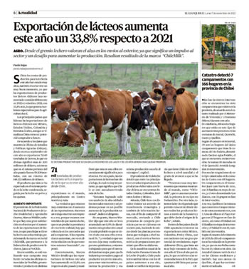 Si bien los costos de producción para la lechería este año han estado muy altos, también el sector vive un muy buen momento, ya que las exportaciones de productos lácteos chilenos han aumentado considerablemente en 2022 en relación a 2021, con 33,8% más, lo que genera excelentes expectativas para la agricultura local.