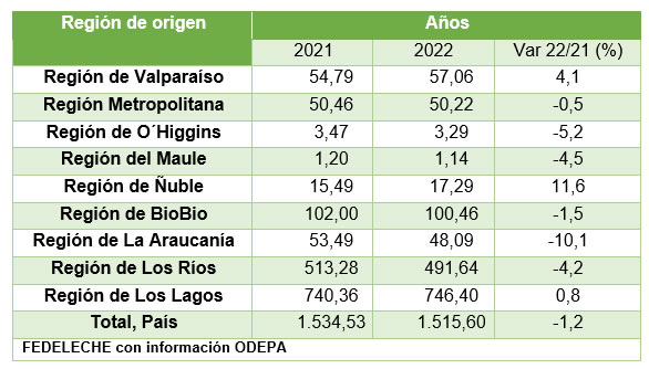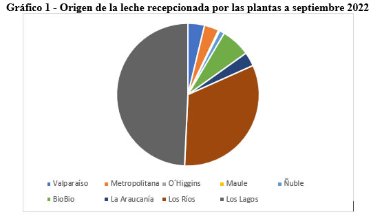 En la región de Los Lagos la producción de leche presentó al mes de septiembre de 2022 una variación de un 0,8% en relación con el año previo y un volumen anual adicional de 9,0 millones de litros, al subir de 740,36 a 746,40 millones. Así, la región de Los Lagos se mantiene como la principal zona productora de leche cruda al concentrar un 49,2% de la producción nacional.