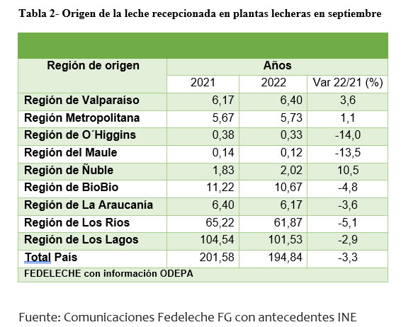 En la región de Los Ríos, la producción de leche sigue siendo menor al año anterior. Al noveno mes de 2022 se registra una caída de un 4,2% en relación con el año anterior, lo que supone una merma de 21,6 millones de litros, valor que equivale caer de 513,28 a 491,64 millones. A nivel país, Los Ríos supone un 32,4% de la producción nacional de leche cruda.