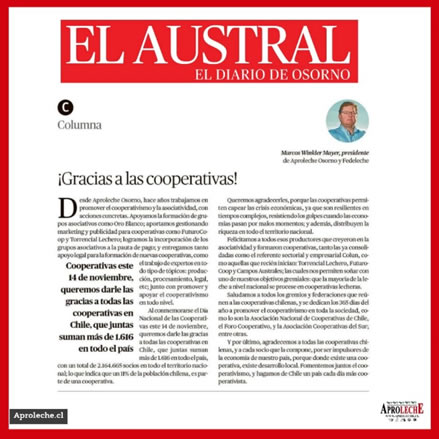 Felicitamos a todos esos productores que creyeron en la asociatividad y formaron cooperativas, tanto las ya consolidadas como el referente sectorial y empresarial Colun, como aquellas que recién inician: Torrencial Lechero, FuturoCoop y Campos Australes; las cuales nos permiten soñar con uno de nuestros objetivos gremiales: que la mayoría de la leche a nivel nacional se procese en cooperativas lecheras.