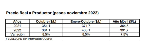 En octubre de 2022 el precio a productor anotó un aumento promedio de un 8,5% respecto al mismo mes de 2021, escalando $30,07 por litro, al subir de $354,07 a $384,14 por litro.