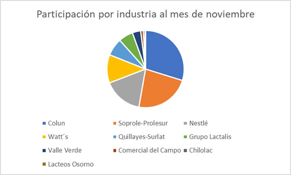 La recepción nacional de leche cruda al mes de noviembre es encabezada por Colun, cuya participación dentro del total alcanza un 29,7%. La cooperativa lechera muestra una variación negativa de 1,0% respecto del mismo lapso del año anterior, alcanzando un total de 591,4 millones de litros, lo que supone una caída interanual de 6,2 millones de litros.