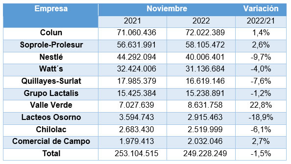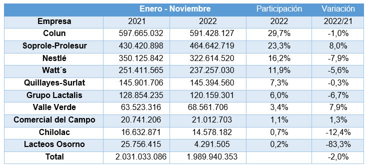 En el tercer lugar, Nestlé Chile registra una participación a noviembre de un 16,2%, con una recepción de leche cruda que suma 322,6 millones de litros, lo que supone una baja de un 7,9% en relación al mismo lapso de 2021, acumulando una caída interanual de 27,5 millones de litros.