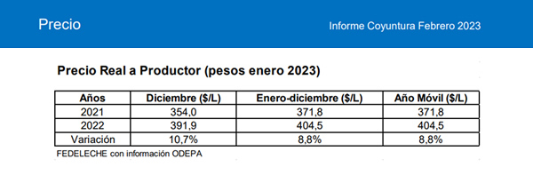 En el último mes de 2022 el precio a productor anotó un aumento promedio de un 10,7% respecto al mismo mes de 2021, escalando $37,94 por litro, al subir de $354,00 a $391,94 por litro.
