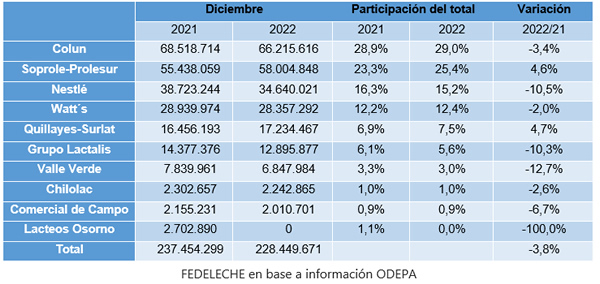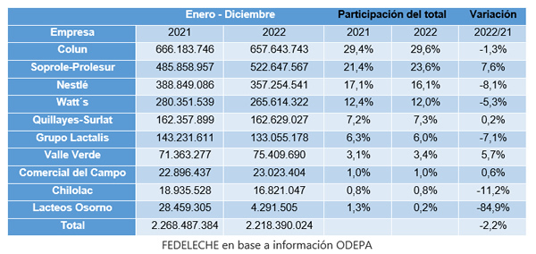 La recepción nacional de leche cruda al mes de diciembre fue encabezada por Colun, cuya participación dentro del total alcanzó un 29,6% en 2022. La cooperativa lechera presentó una variación negativa de 1,3% respecto del año anterior, alcanzando un total de 657,6 millones de litros, lo que supone una caída interanual de 8,5 millones de litros.
