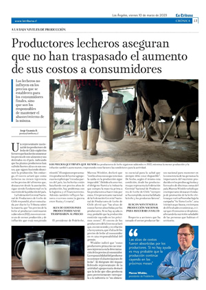 El presidente de Fedeleche, Marcos Winkler, declaró que 'con los altos costos que tenemos la caída en la producción sigue imparable'. Debido a lo anterior, el dirigente llamó a la industria que compra la materia prima a los productores a hacer más por estos. El representante nacional de la Federación Gremial Nacional de Productores de Leche de Chile alertó que 'las alzas de costos fueron absorbidas por los productores. Si no hay ayuda es muy probable que la producción continúe cayendo en los próximos meses'. El vocero de los productores del alimento aclaró que, en este sentido y en relación a la coyuntura, que el alza de los precios de leche al consumidor no es una responsabilidad del gremio. Winkler indicó que 'como productores primarios no tenemos injerencia en la determinación de los precios al consumidor.
