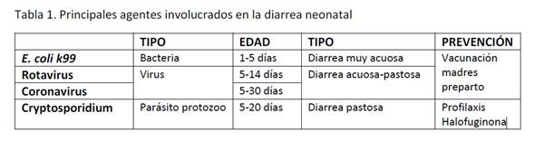 Dentro de las causas infecciosas, la más frecuente es la que conocemos como diarrea neonatal indiferenciada, que puede ser provocada por distintos patógenos (Tabla N°1) que pueden ejercer su acción de forma aislada o mixta (lo que ocurre más frecuentemente), participando varios de ellos a la vez. También hay otras causas infecciosas de diarrea menos frecuentes, pero no por ello menos importantes, como la presencia de clostridios o salmonellas.