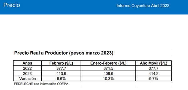 En el segundo mes de 2023, el precio a productor anotó un aumento promedio de un 9,6% respecto al mismo mes de 2022, escalando $36,20 por litro, al subir de $377,69 a $413,89 por litro.