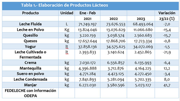 Según los datos proporcionados por la industria láctea mayor a la Oficina de Estudios y Políticas Agrarias (Odepa), y divulgadas por Fedeleche, la elaboración de productos lácteos al mes de febrero de 2023 presenta un comportamiento mayormente a la baja, con 8 de las 11 categorías consideradas en las estadísticas con un menor volumen de producción respecto del año anterior.
