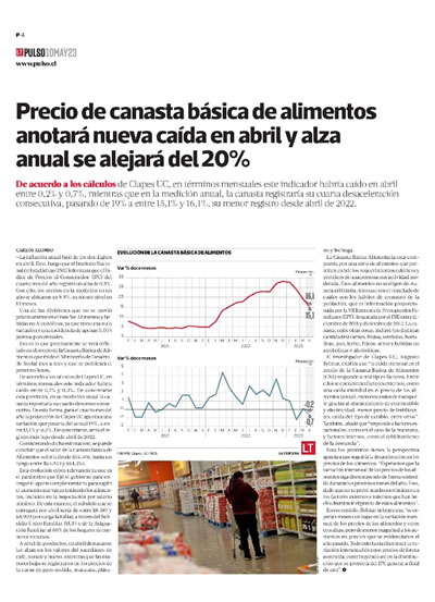 El investigador de Clapes-UC, Augusto Belmar, explica que "la caída mensual en el precio de la Canasta Básica de Alimentos (CBA) responde a múltiples factores. Entre ellos se encuentran factores externos, como una caída mundial en el precio de los alimentos (anual), menores costos de transporte gracias al abaratamiento de combustible y electricidad, menor precio de fertilizantes, caída del tipo de cambio, entre otros". También, añade que "responde a factores estacionales, como en el caso de la manzana, y factores internos, como el debilitamiento de la demanda".