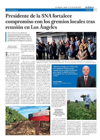 En dependencias de la Sociedad Agrícola de Biobío, en Los Ángeles, el presidente de la Sociedad Nacional de Agricultura SNA, Antonio Walker, quien recientemente asumió en el cargo, se reunión con más de 15 representantes del sector productivo, quienes expusieron sobre diversos temas y propuestas relacionadas con el desarrollo del agro en la región.