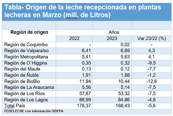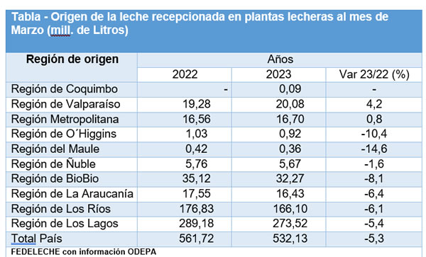 De acuerdo con los antecedentes elaborados por la Federación Nacional de Productores de Leche (Fedeleche) en base a los datos publicados por la Oficina de Estudios y Políticas Agrarias (Odepa), la producción nacional de leche cruda en comparación con igual periodo del año anterior registra al mes de marzo una caída de un 5,3%, sumando un total de 532,13 millones de litros.
