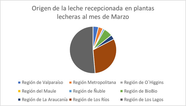 En el primer trimestre de 2023, las zonas con un mayor volumen de producción, las regiones de Los Lagos y Los Ríos, representan un 82,6% de lo que se recepciona por la industria láctea mayor, y presentan, a la fecha, un resultado negativo. En el resto del país lechero se aprecia una respuesta a la baja, salvo Valparaíso y Metropolitana.