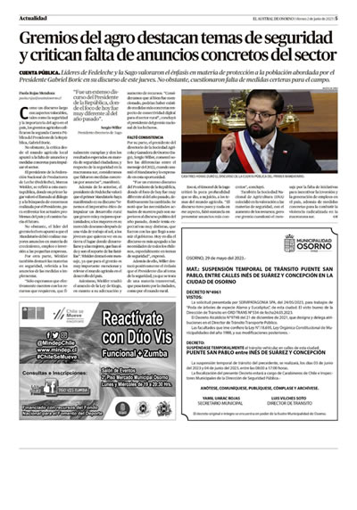 Por su parte, el presidente del directorio de la Sociedad Agrícola y Ganadera de Osorno (Sago), Sergio Willer, comentó sobre las diferencias entre el mensaje del 2022, cuando asumió el Mandatario y lo expresado en esta oportunidad."