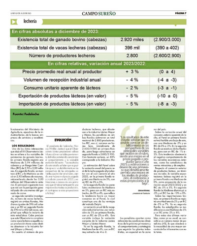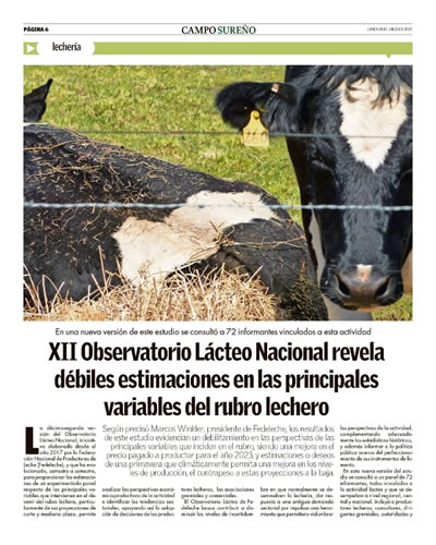 El presidente de Fedeleche, Marcos Winkler, destacó que el Observatorio Lácteo proporcionó valiosa información en variables previamente definidas permitiendo caracterizar el comportamiento y la probable evolución del sector. "Los resultados de este estudio señalan que es posible apreciar un debilitamiento en las perspectivas de las principales ve-nobles que inciden en el rubro, siendo una mejora en el precio pagado a productor para el año 2023, y estimaciones o deseos de una primavera que climáticamente permita una mejora en los niveles de producción, el contrapeso a estas proyecciones a la baja"