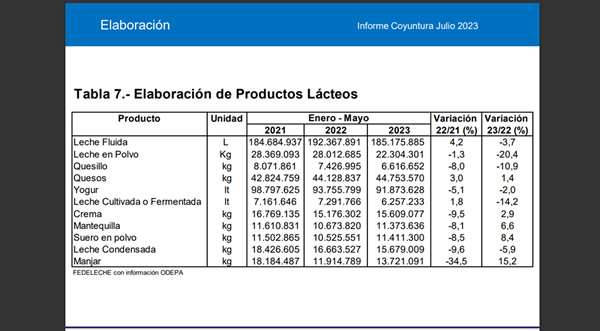 De igual manera, la elaboración de leche fluida cerró con una caída de 3,7%, con 7,1 millones de litros menos respecto del mismo periodo de 2022, pasando de 192,3 a 185,1 millones de litros.