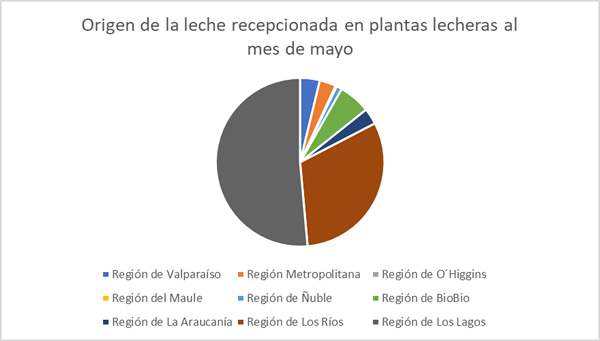 La producción de leche en la región de Los Lagos presenta al mes de mayo una variación negativa de 6,7% en relación con el año anterior, acumulando, a la fecha, 426,85 millones de litros, lo cual supone caer en 30,5 millones respecto del ejercicio anterior. De todas formas, la región de Los Lagos se mantiene como la principal zona productora de leche a nivel nacional al concentrar un 50,2% de participación.
