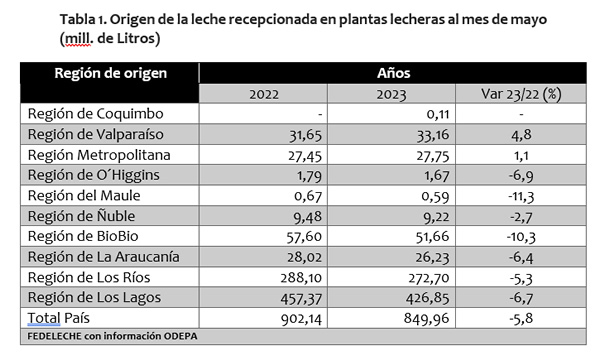 De acuerdo con los antecedentes elaborados por la Federación Nacional de Productores de Leche (Fedeleche) en base a los datos publicados por la Oficina de Estudios y Políticas Agrarias (Odepa), la producción nacional de leche cruda registra al mes de mayo una caída de un 5,8% en comparación con igual periodo del año anterior, sumando un total de 849,56 millones de litros.