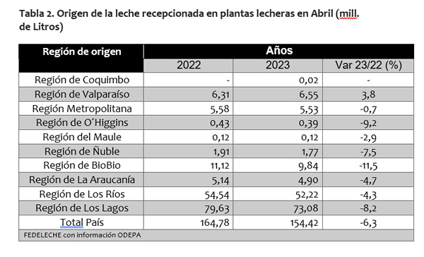 En los primeros cinco meses de 2023, las zonas con un mayor volumen de producción, las regiones de Los Lagos y Los Ríos, suponen un 82,3% de lo que recepciona la industria láctea mayor, distritos que, a la fecha, mantienen un resultado negativo. En el resto del país lechero se aprecia una respuesta también a la baja, salvo en la zona centro.