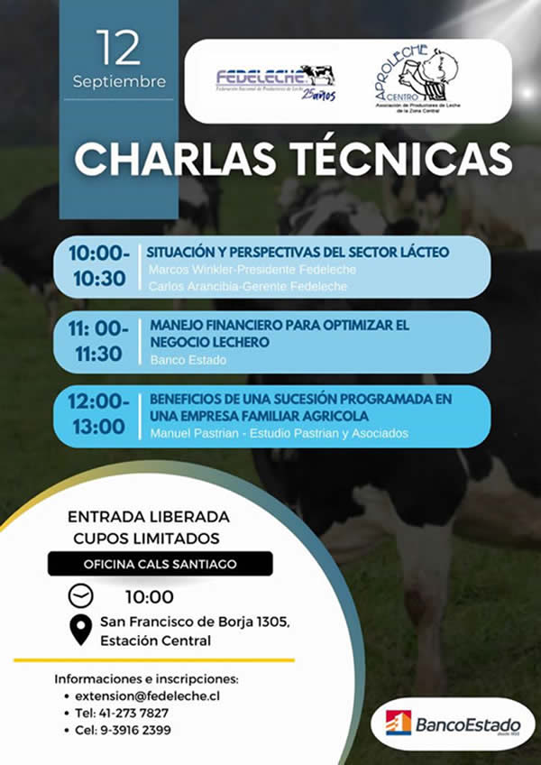 En dependencias de la Cooperativa Agrícola Lechera Santiago (CALS), la Federación Nacional de Productores de Leche (Fedeleche) ofrecerá para los productores de la zona central el ciclo de charlas de actualización en producción de leche, una instancia útil para analizar la situación y perspectivas del sector lácteo, así como para conocer opciones financieras que permiten optimizar el negocio lechero y a su vez para abordar la sucesión programada en las empresas familiares agrícolas.