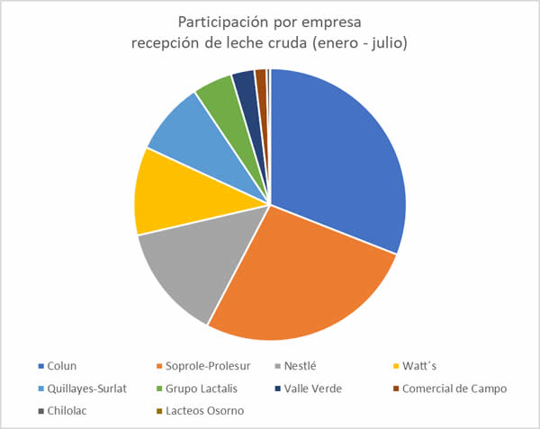 La recepción nacional de leche cruda sigue siendo liderada por Colun, cuya participación dentro del total alcanza un 30,2%.