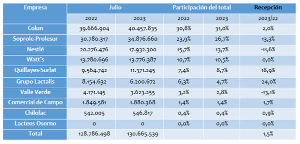 En el mes de julio, la recepción de leche de la industria láctea mayor llega a 130,6 millones de litros, volumen que representa un alza de 1,5% respecto al mismo mes del año anterior, lo que se traduce en un aumento de 1,8 millones de litros frente al mismo mes de 2022.