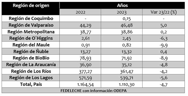 Por su parte, en la región de Bio-Bio, la producción de leche cruda apunta una caída de un 1,0%, lo que equivale a 102 mil litros menos. La producción de leche cruda alcanzó 10,59 millones de litros.