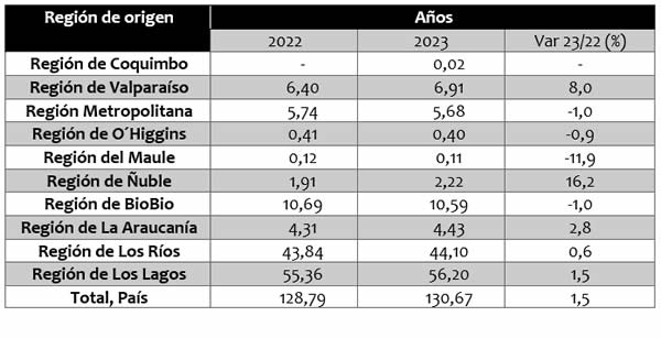 En la región de Los Lagos, la producción de leche cruda sube un 1,5% respecto del mismo mes del año anterior, lo que supone un alza de 846 mil litros, sumando un total de 56,20 millones de litros.