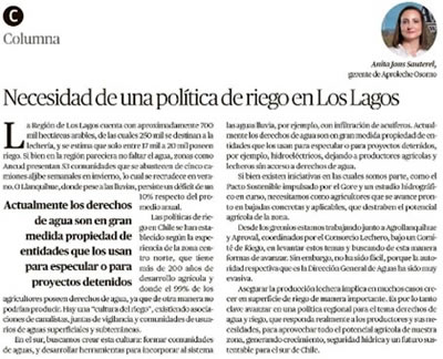 Asegurar la producción lechera implica en muchos casos crecer en superficie de riego de manera importante. Es por lo tanto clave avanzar en una política regional para el tema derechos de agua y riego, que responda realmente a los productores y sus necesidades, para aprovechar todo el potencial agrícola de nuestra zona, generando crecimiento, seguridad hídrica y un futuro sustentable para el sur de Chile.