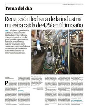 El presidente de Fedeleche y de Aproleche Osorno, Marcos Winkler, explicó que la disminución en la producción nacional alcanza ya un 4,7%, lo que se traduce en que la industria ha bajado la recepción de la materia prima, donde Nestlé y el grupo Lactalis son las que han presentado el mayor descenso.