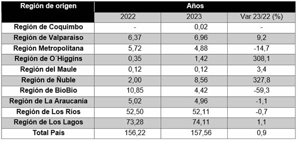 Finalmente, la región de El Maule registra un aumento de 3,4% respecto de agosto de 2022, con un avance de 3,9 mil litros, sumando un total de 119 mil litros.