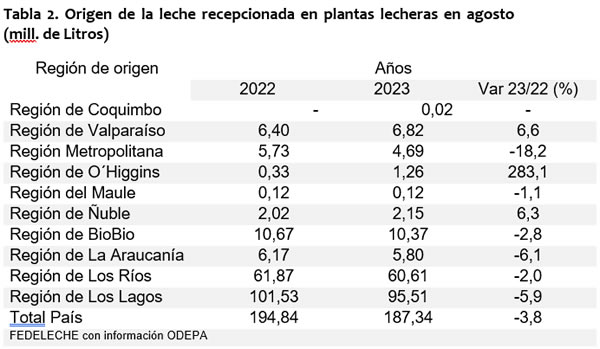 La producción de leche en la región de Los Lagos presenta al mes de septiembre una variación negativa de 5,0% en relación con el mismo periodo del año anterior, sumando 709,32 millones de litros, lo cual supone caer 37,0 millones respecto del ejercicio anterior. De todas formas, la región de Los Lagos se mantiene como la principal zona productora de leche cruda a nivel nacional al concentrar un 48,7% de participación.