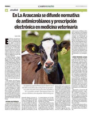 En el sistema que se encuentra en marcha blanca hasta el 31 de diciembre y a partir del 1 de enero empieza hacer obligatorio los médicos veterinarios deben realizar las prescripciones electrónicas de los antimicrobianos registrados en el Servicio para que así se pueda efectuar la compra de los productos y el tratamiento efectivo de ellos en el predio', detalló Verónica Seguel, del Subdepartamento de Registro y Control Medicamentos Veterinarios de la División Protección Pecuaria del SAG.