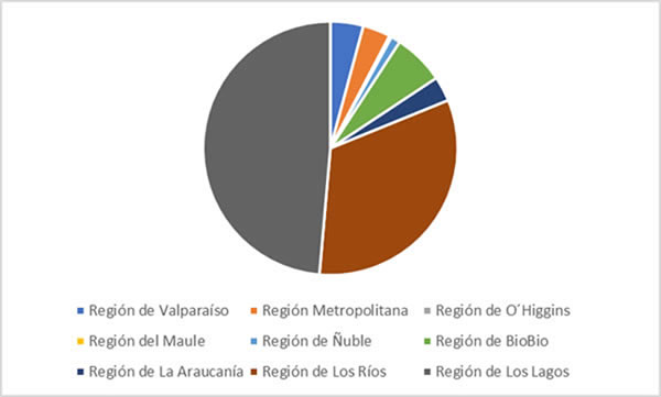 La producción de leche en la región de Los Lagos mantiene al mes de octubre de 2023 una variación negativa de 4,7% en relación con el mismo periodo del año anterior, sumando 834,28 millones de litros, lo cual supone caer 40,7 millones respecto del ejercicio anterior. De todas formas, la región de Los Lagos se mantiene como la principal zona productora de leche cruda a nivel nacional al concentrar un 49,4% de participación.