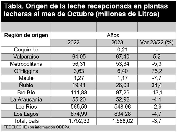 De acuerdo con los antecedentes elaborados por la Federación Nacional de Productores de Leche (Fedeleche) en base a los datos publicados por la Oficina de Estudios y Políticas Agrarias (Odepa), la producción nacional de leche cruda al mes de octubre presenta una caída de 3,7% en comparación con igual periodo del año anterior, sumando un total de 1.688,02 millones de litros.