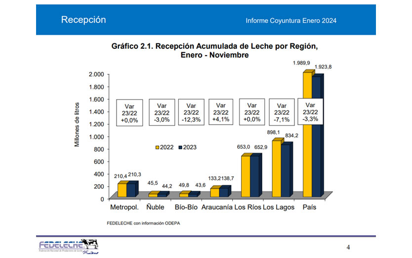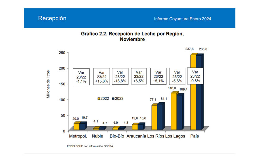 En el desglose de lo que ocurrió en el país lechero, la principal zona productora, como es la región de Los Lagos, donde se concentra un 43,4% de la recepción nacional de leche cruda, se registró una baja de 7,1% respecto al mismo periodo de 2022, cayendo de 898,1 a 834,2 millones de litros, lo cual supone una caída interanual de 63,9 millones de litros. Por lejos la más incidente en el resultado actual.
