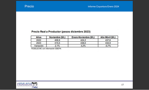 En el undécimo mes de 2023, el precio a productor aumenta un 2,1% respecto al mismo mes de 2022, equivalente a $8,63 por litro, al subir de $ 406,85 a $ 415,49.