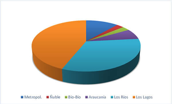 En la región de Los Lagos, que concentró un 43,7% de la leche cruda que se recepcionó por parte de la industria láctea mayor, se presentó – en línea con la tendencia nacional, una variación negativa de un 6,3% frente al año anterior, sumando un total de 943,7 millones de litros, valor que refleja a su vez una baja interanual de 63,7 millones de litros, confirmando la gran incidencia que marca esta región en la situación lechera local.