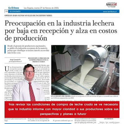 El gremio señala que "en el año 2023, la recepción nacional de leche cruda alcanzó 2.159,5 millones de litros, representando una caída del 2,7% respecto a 2022". De enero a diciembre de 2023, la recepción nacional experimentó una disminución de 59,1 millones de litros en comparación con el mismo periodo del año anterior, afectada principalmente por incrementos en los costos de producción, menores precios y factores climáticos, situando este periodo como el tercer año consecutivo a la baja.